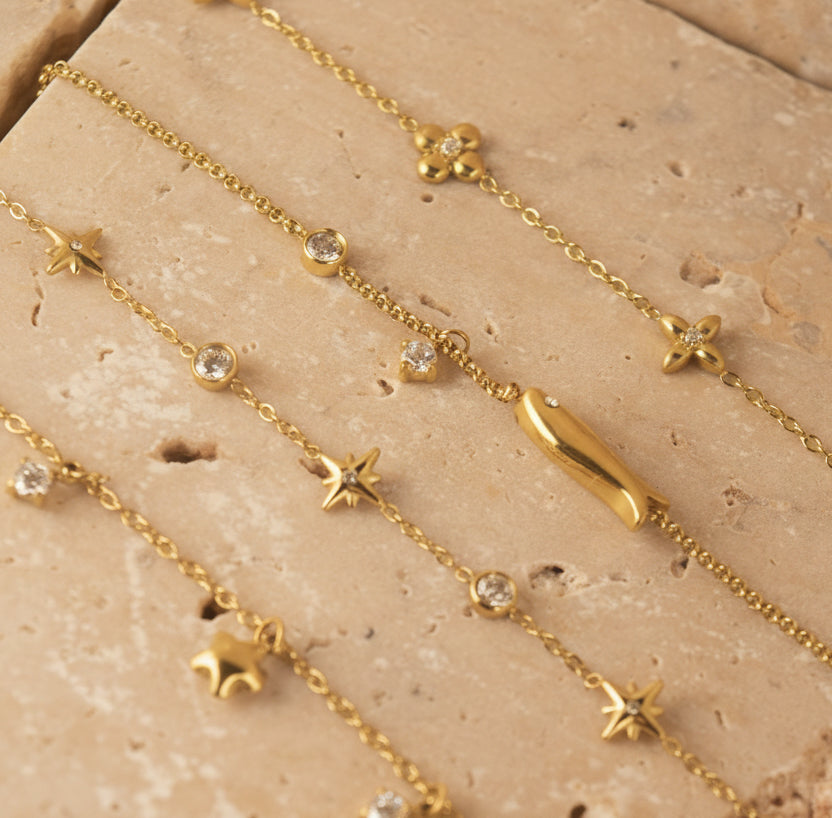 Made from premium PVD-coated titanium steel, every bracelet is fully waterproof, tarnish-free, sweat-proof, and hypoallergenic, ensuring long-lasting shine and comfort for sensitive skin. The set includes a delicate chain featuring a sparkling zircon star pendant, adding a touch of soft celestial sparkle to the stack.