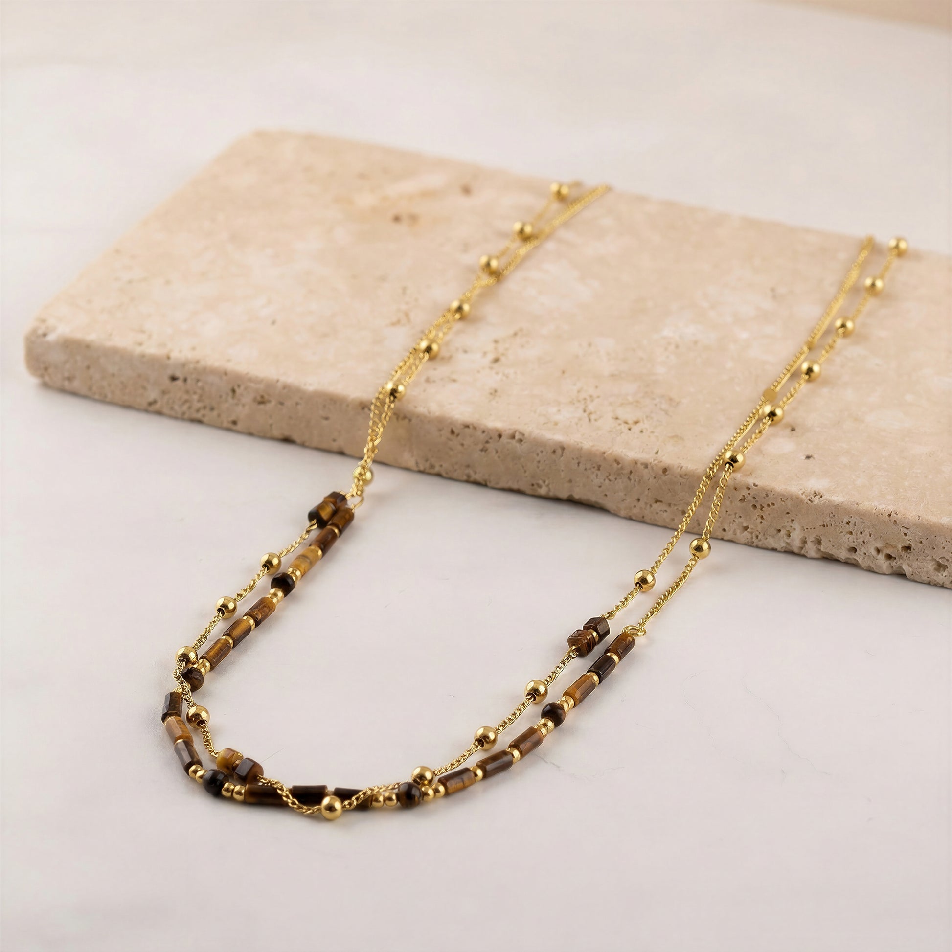 Effortless and grounded, the Amber Double Chain Necklace brings warmth and dimension to everyday styling. Featuring delicate gold chains accented with rich tiger eye beads, this double layered design creates a natural sense of movement and depth.
