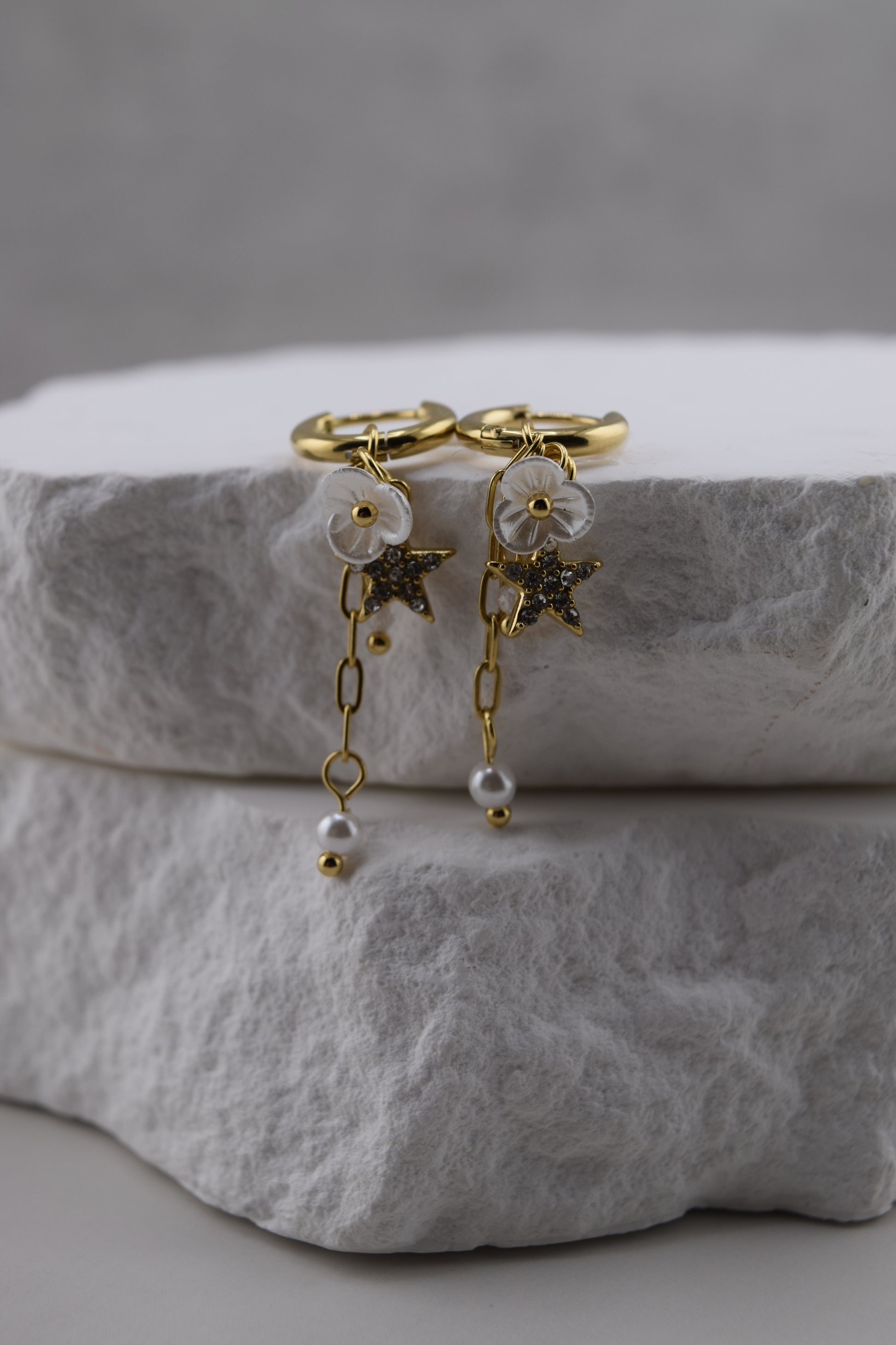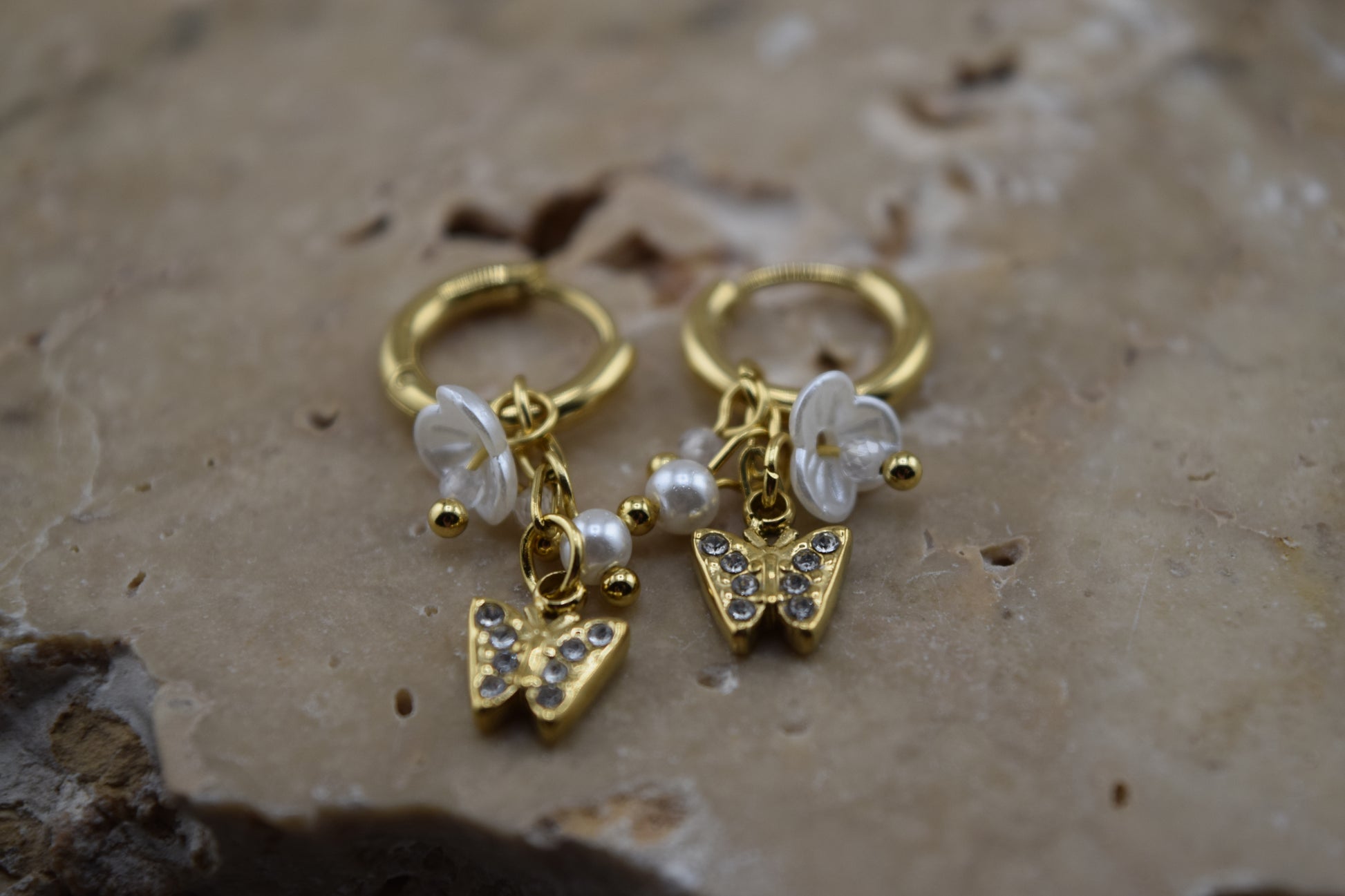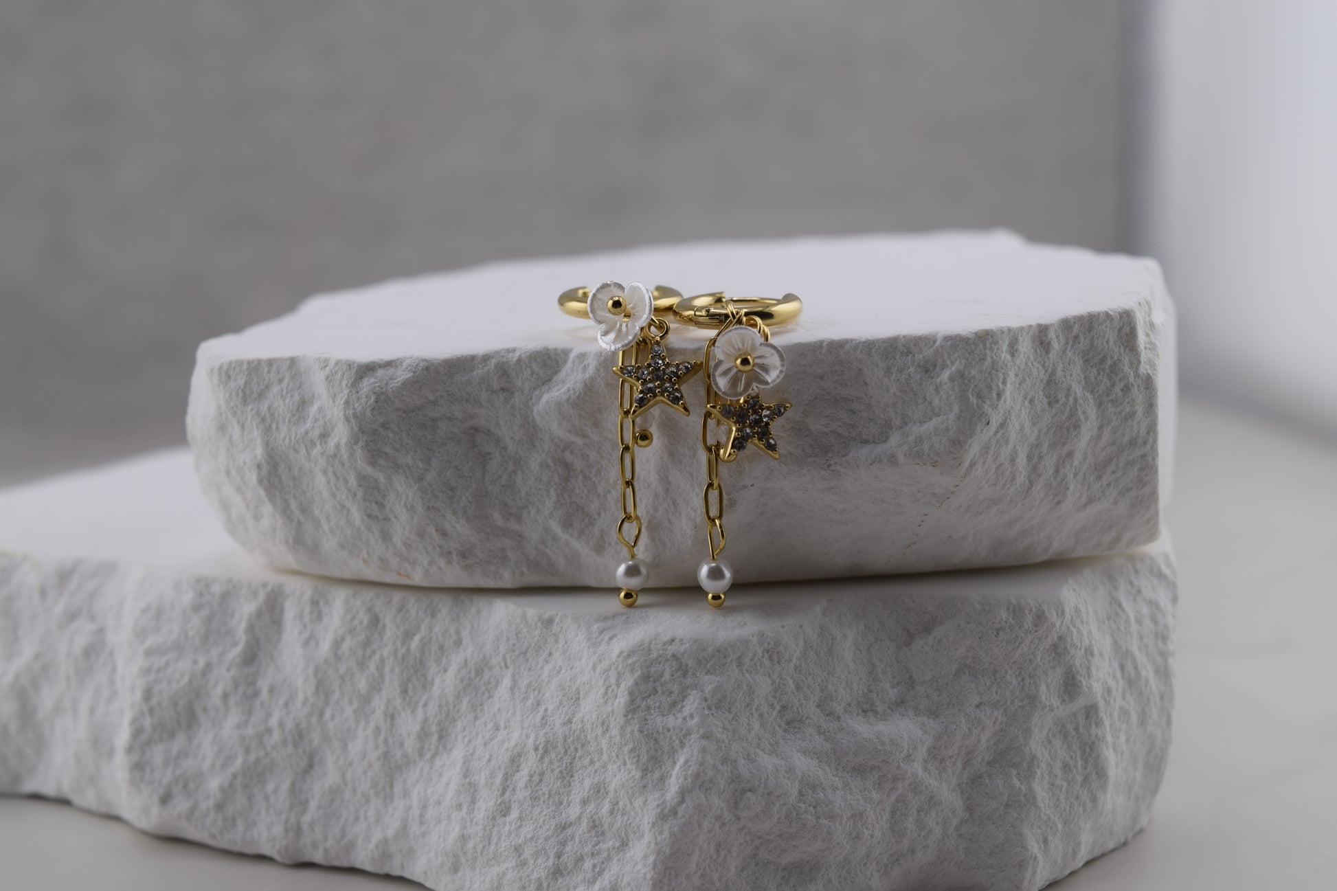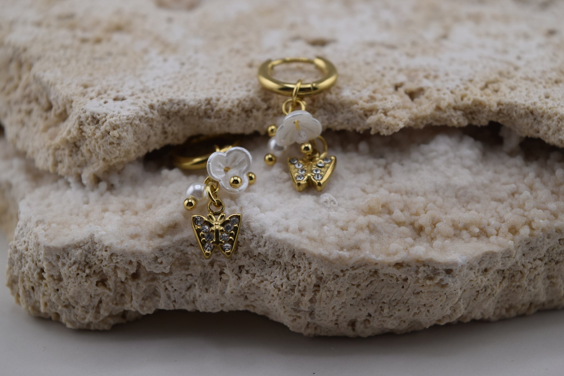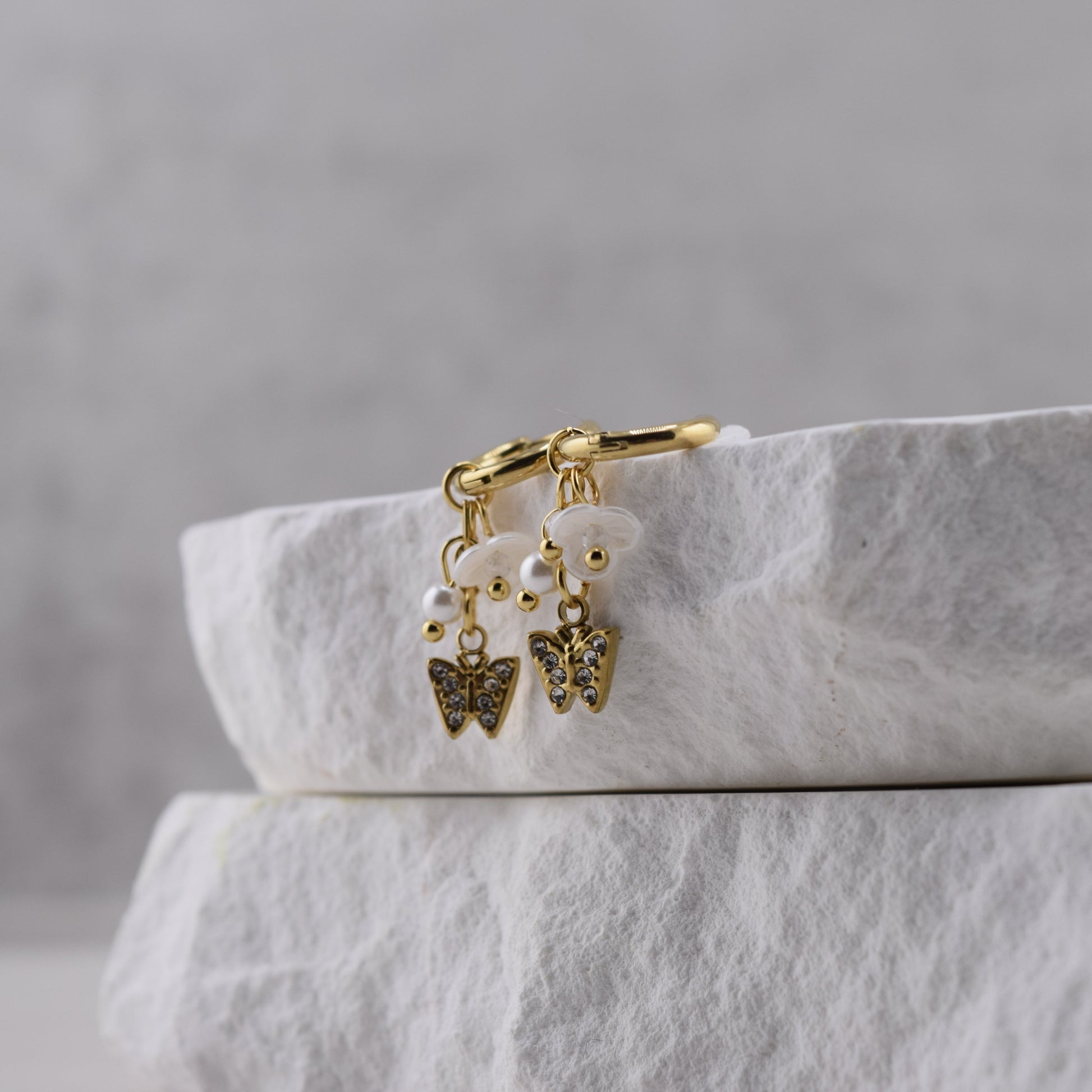 Inspired by delicate spring blooms and open skies, these charm huggies pair shimmering butterfly or radiant star charms with dainty pearls and translucent floral beads for a look that feels soft, whimsical, and effortlessly refined.