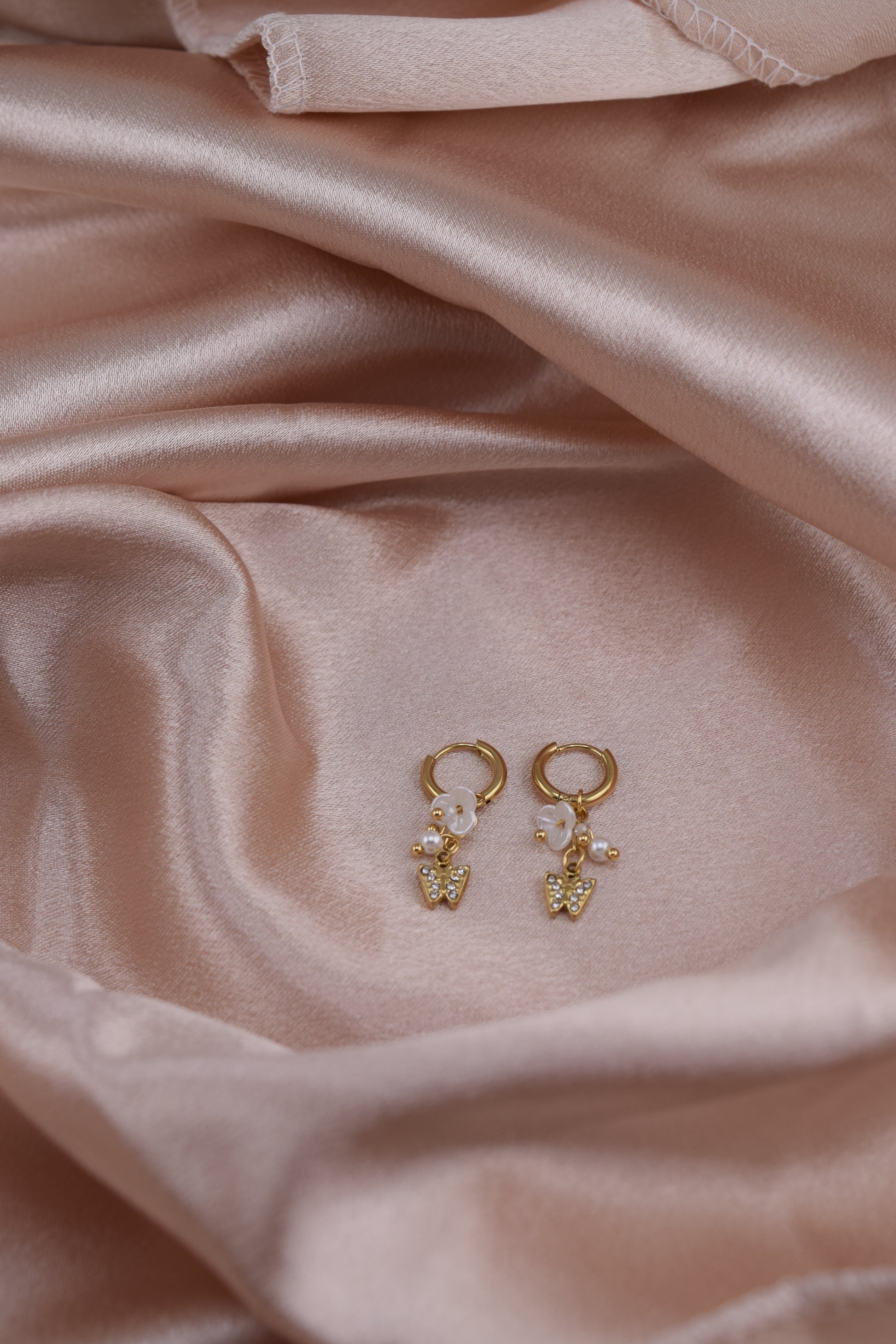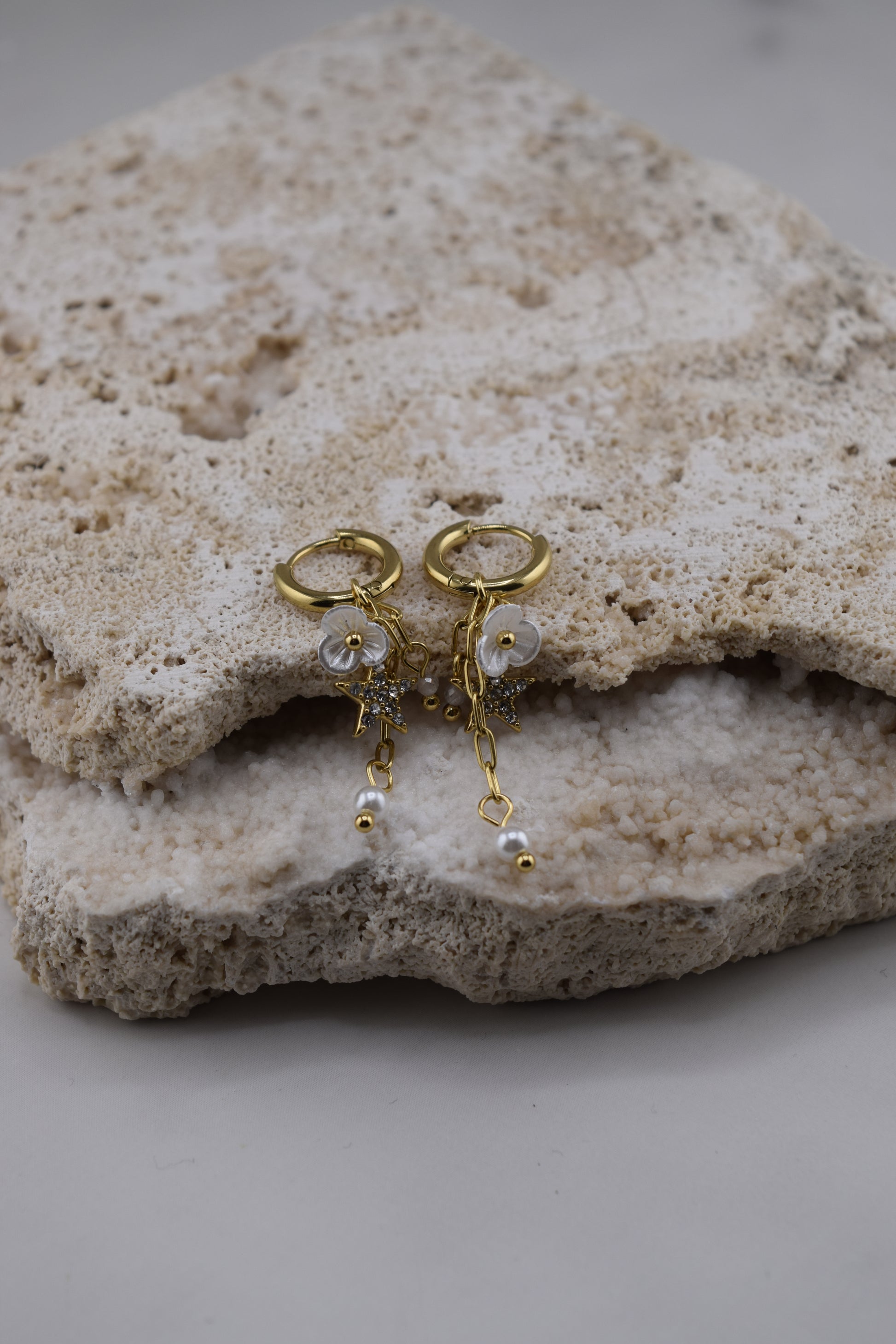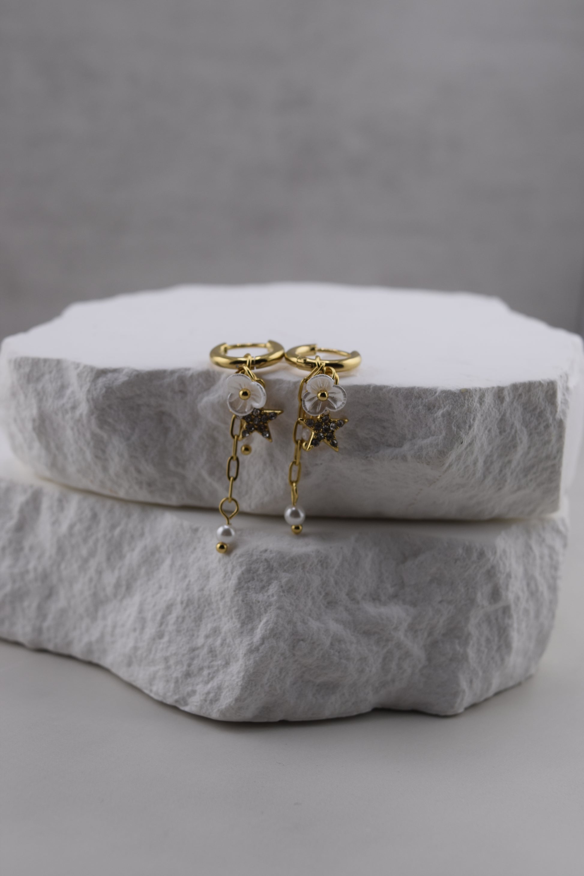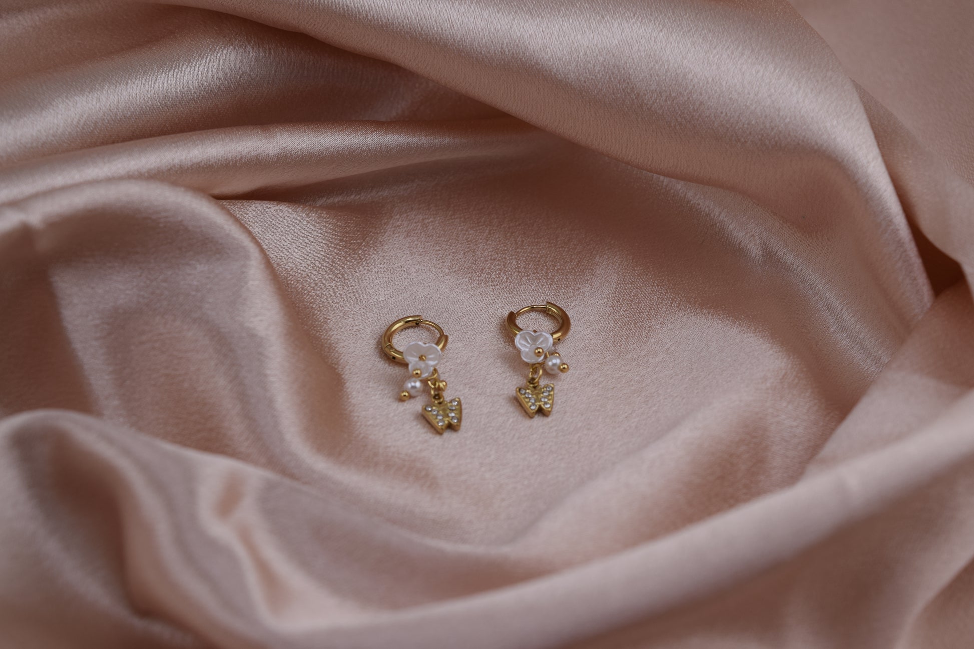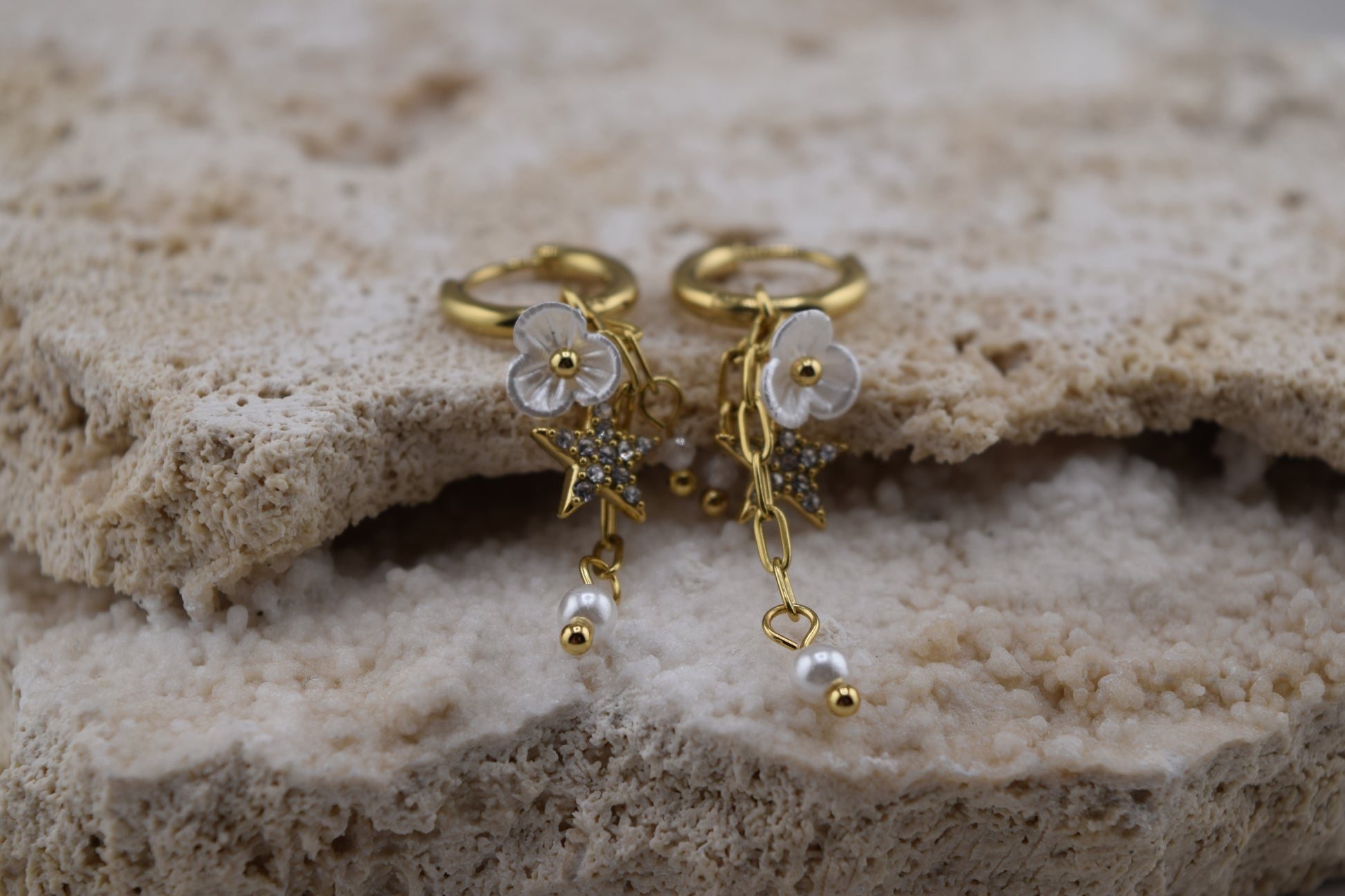 Inspired by delicate spring blooms and open skies, these charm huggies pair shimmering butterfly or radiant star charms with dainty pearls and translucent floral beads for a look that feels soft, whimsical, and effortlessly refined.