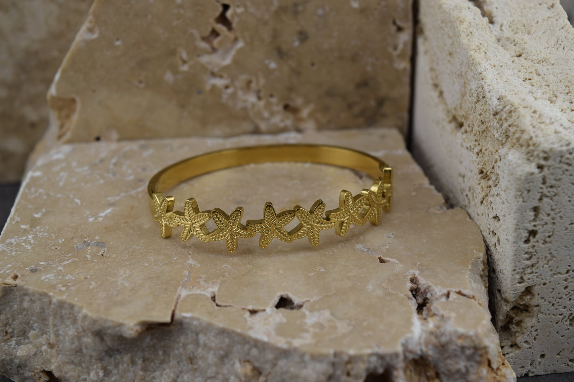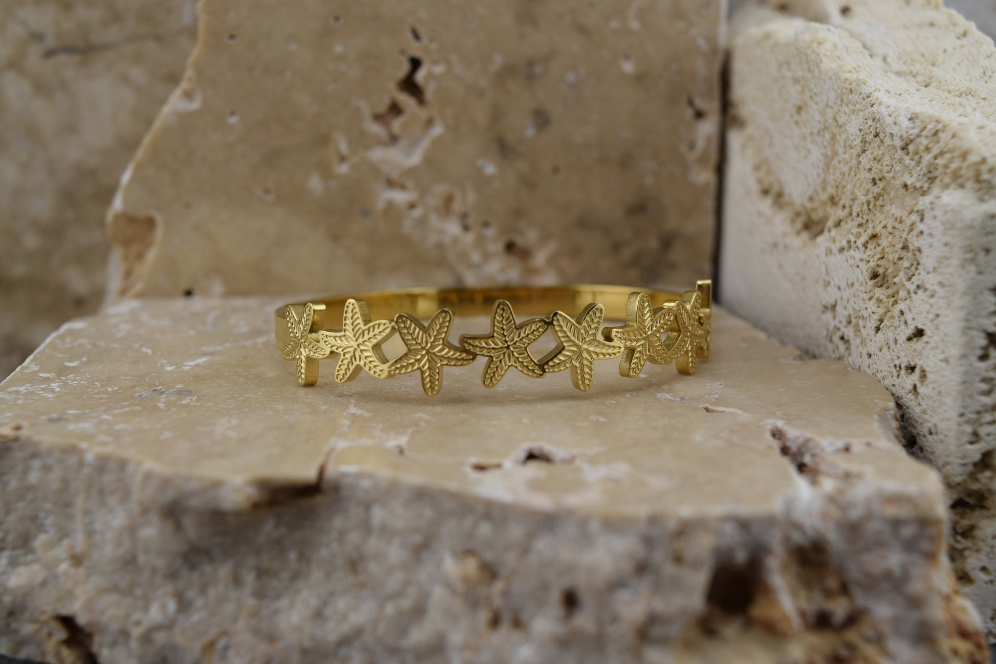 Inspired by ocean tides and sun-warmed sands, the Starfish Clasp brings a touch of coastal beauty to your everyday look. Featuring a row of intricately sculpted gold starfish along a sleek, open cuff design, this piece blends delicate detail with bold, modern shape. Each starfish catches the light with a soft, dimensional shimmer, creating a statement that feels both natural and elevated.