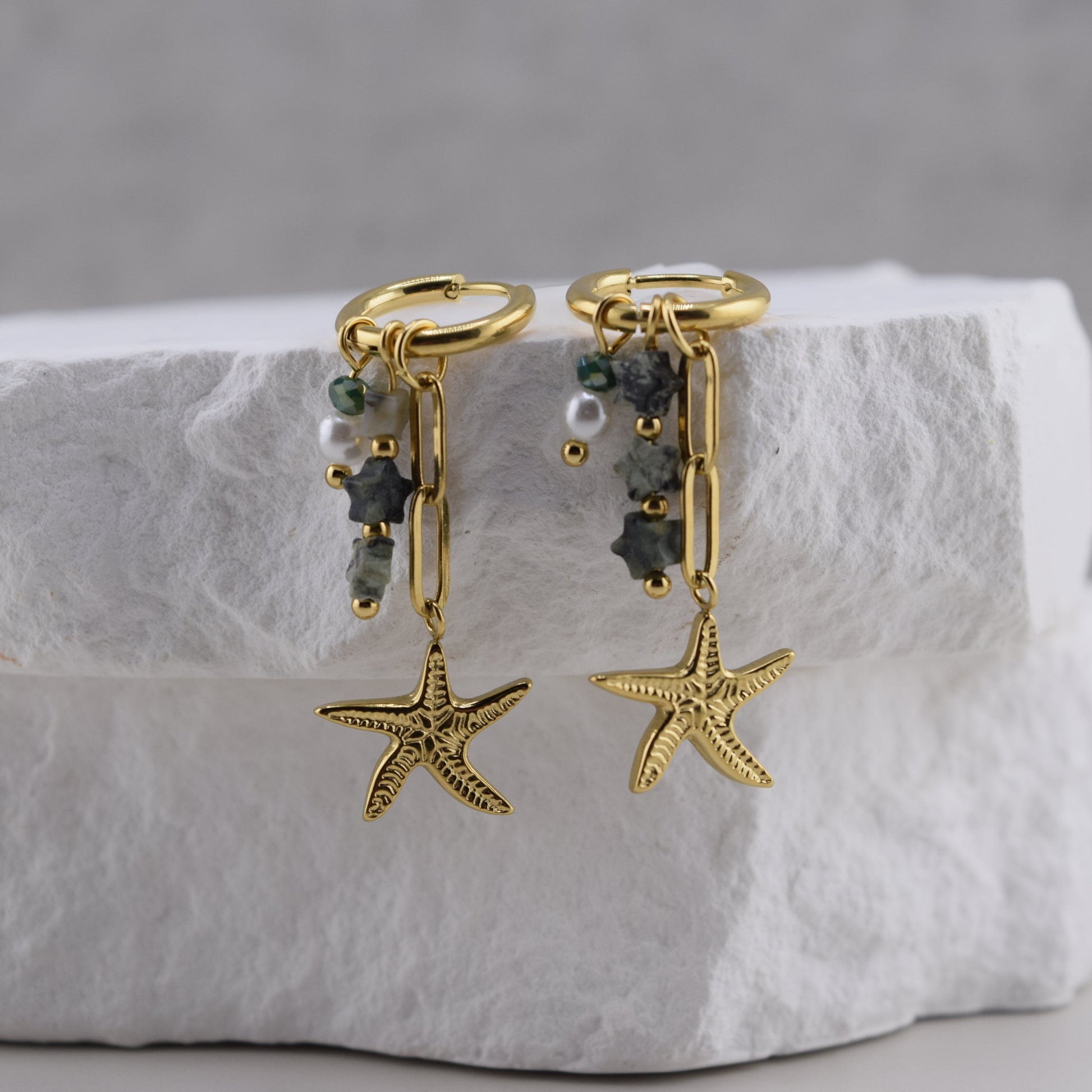 The Starfish Huggies Gold Charm Earrings blend modern structure with coastal texture for a look that feels both organic and elevated. A polished gold huggie hoop anchors a delicate paperclip-style drop, finished with a layered cluster of sea-toned beads, luminous freshwater pearls, and an intricately detailed starfish charm.