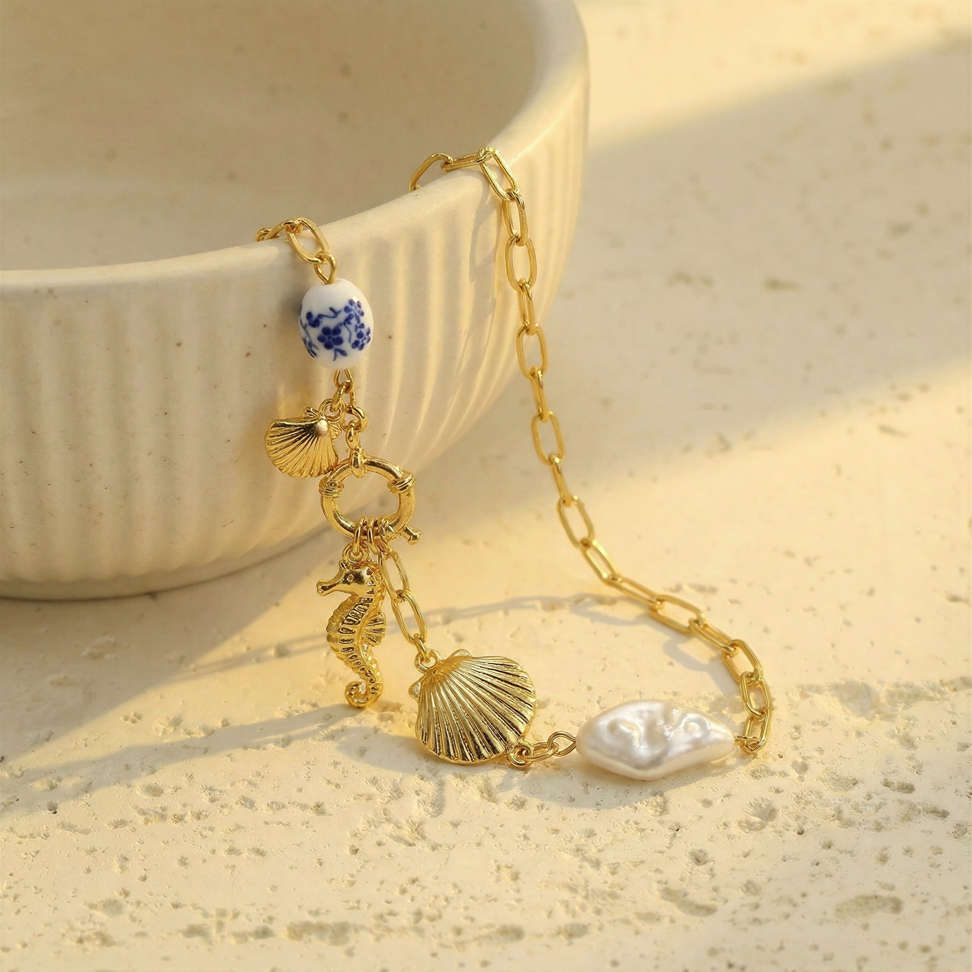 The Tides & Waves Charm Bracelet blends ocean-inspired symbolism with delicate, artisanal detailing. Featuring a curated mix of charms, including a seahorse, seashell, luminous pearl accents, and porcelain-inspired elements. This piece brings texture, movement, and meaning together in one effortless design.